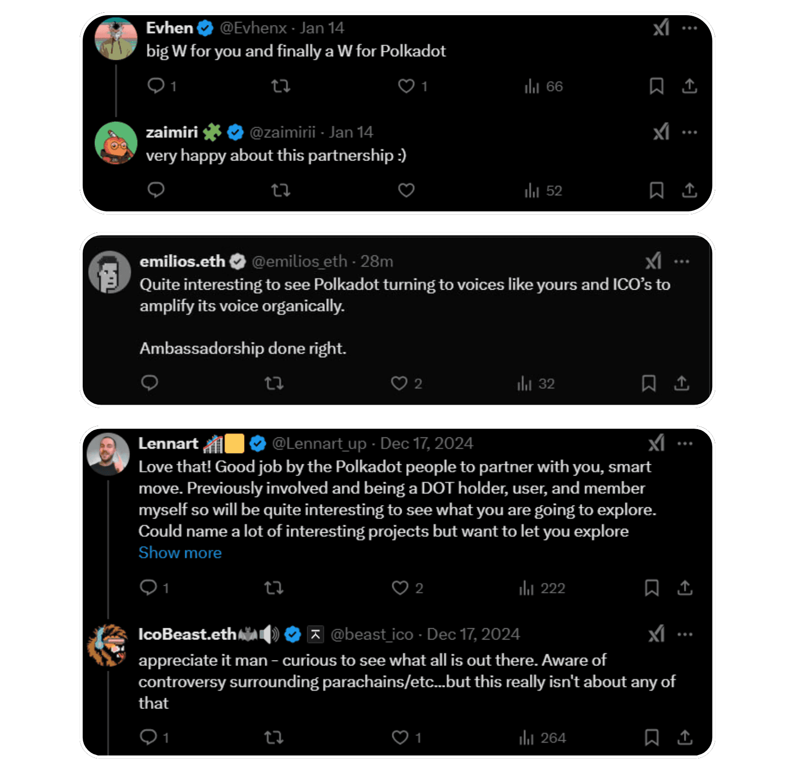 Creators delivered 100+ posts and threads in under a month, enough consistent volume to keep Polkadot present in the feed without overwhelming it. What mattered even more was how far the content traveled: non-partnered KOLs began sharing, quoting, and adding their own takes, extending the campaign’s reach well beyond the initial roster.