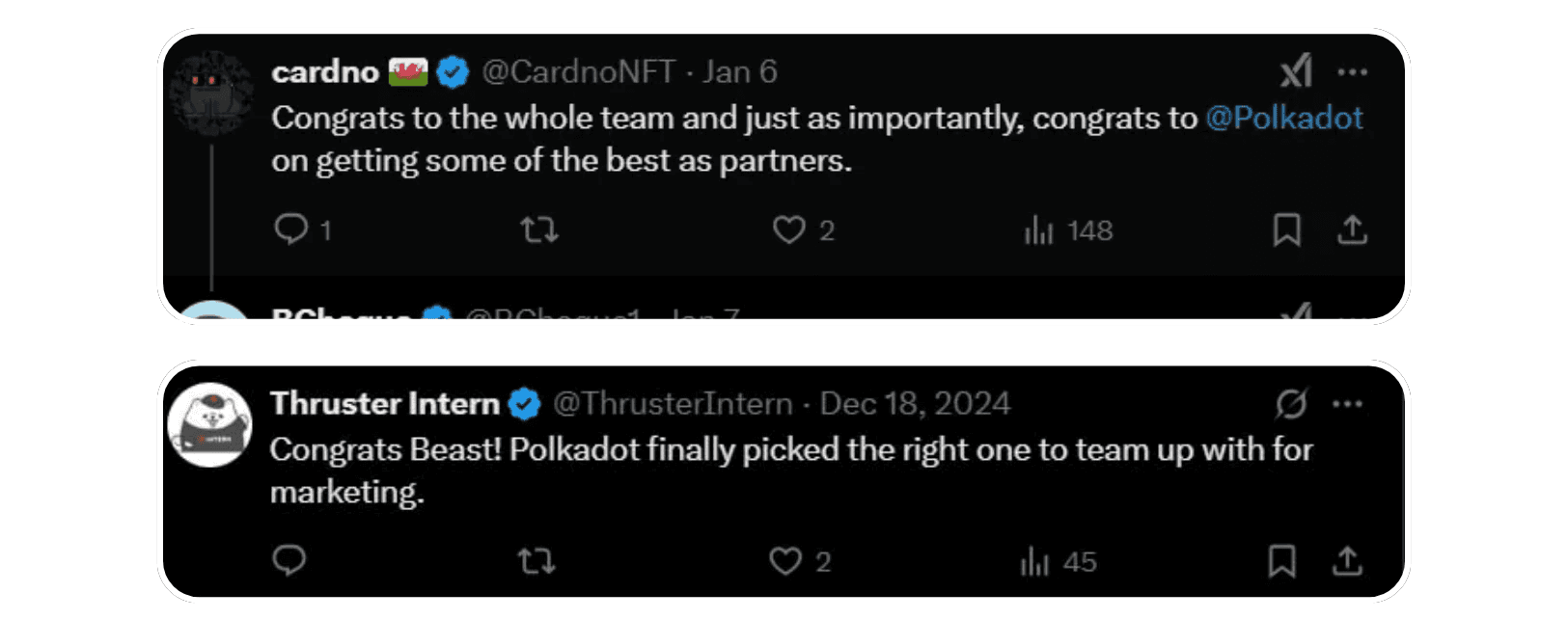 As posts gained traction, community members started calling the activation “a win for Polkadot,” praising the choice of creators and the renewed energy around the ecosystem. The screenshots included here capture that reaction in real time - genuine comments, congratulatory messages, and a clear sense that the narrative was moving in the right direction.